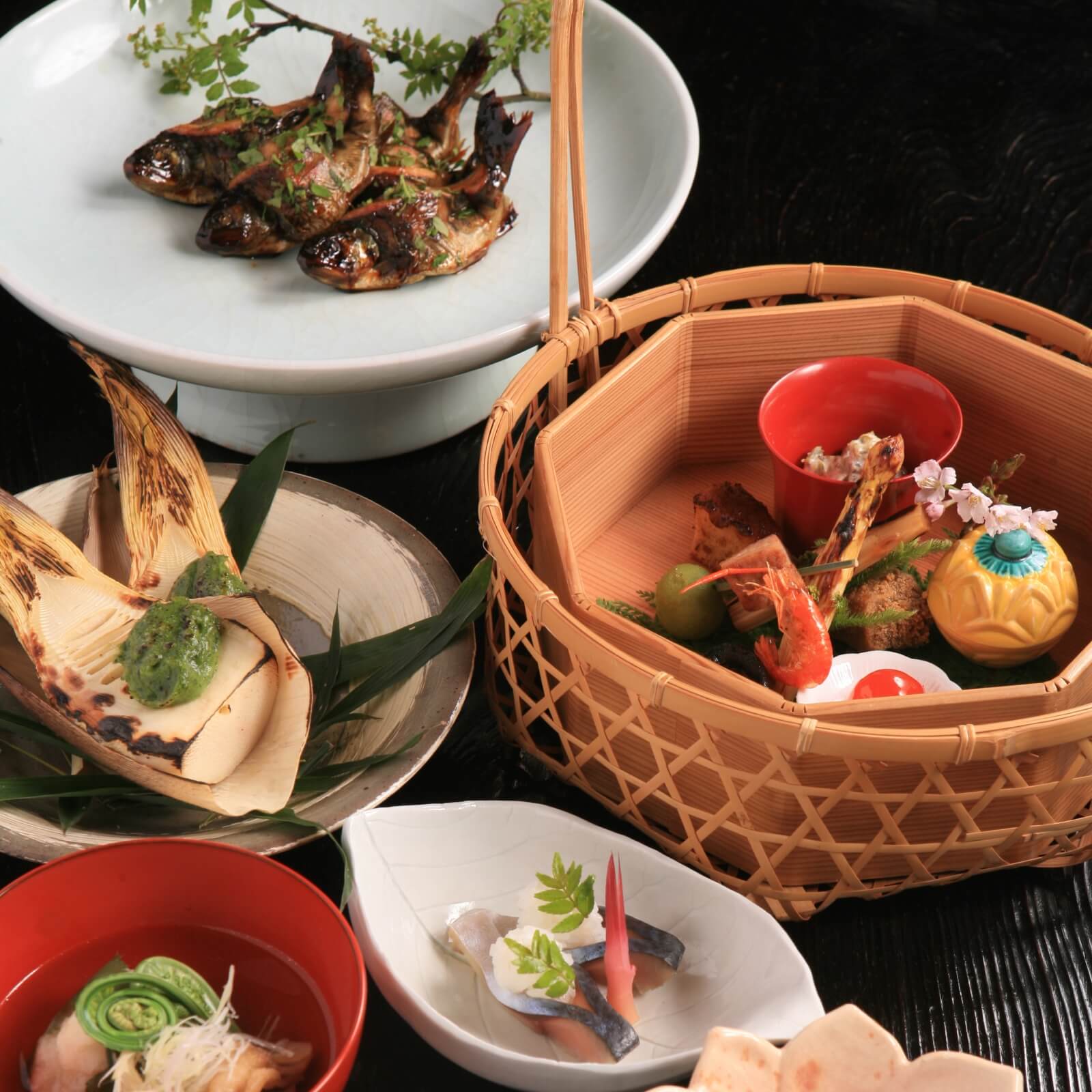 元来、平安貴族が四季を楽しむのに野草を摘み料理したのが始まりの「摘草料理」。日本人には四季の移ろいを肌で感じ愛でる文化がある、美山荘はそれを現代に美しく洗練された形で一皿に体現している。地元の豊富な食材はご当主自らが野山に入り集めた滋味の数々。代々、時代に合わせて研鑽された独自の技術で、優雅な風情を添える。都の風雅と里山の野趣を心行くまで楽しみたい。