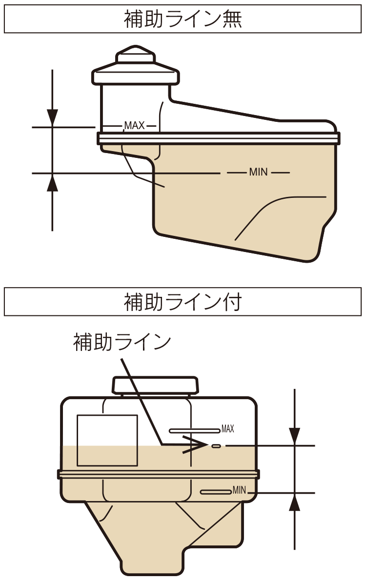 液量がリザ-バータンクのMAX(上限)とMIN(下限)の間にあるかを点検します。