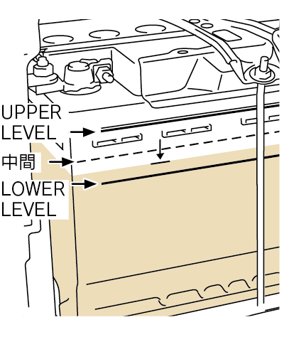 バッテリー液面がUPPER LEVEL(上限)とLOWER LEVEL(下限)の中間以下のときは、UPPER LEVEL(上限)まで補充液または蒸留水を補充してください。