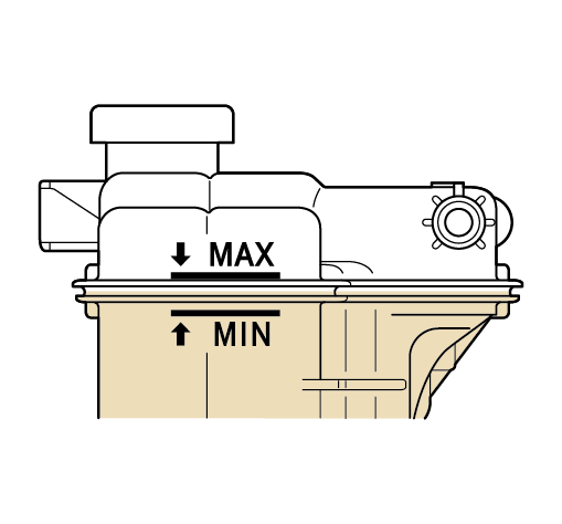 ラジエーターリザーバータンクの冷却水の量が、タンク側面のMAX(上限)とMIN(下限)またはFULL(上限)とLOW(下限)の間にあるか点検します。