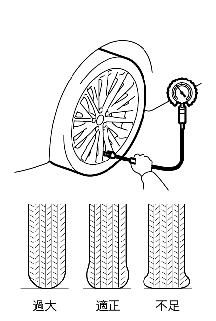 タイヤが冷えているときの、タイヤのたわみ状態(つぶれ具合)により、空気圧が適正かどうかを点検します。