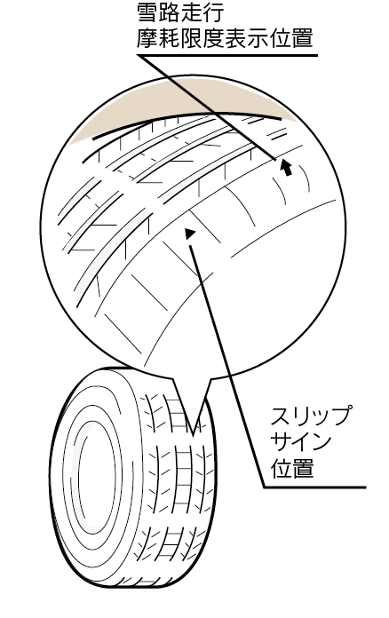 ※ 水のたまった道路を高速で走行すると、タイヤと路面の間に水が入り込み、タイヤが路面から浮いてしまい、ハンドルやブレーキが効かなくなる現象。 - ● オールシーズンおよびスタッドレスタイヤは雪路走行摩耗限度表示が現れたら、(新品時溝深さの1/2に現れます)積雪路、凍結路の走行は避けてください。スリップ事故につながるおそれがあり危険です。