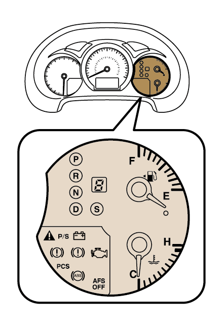 エンジンスタートストップスイッチをイグニッションONモード(エンジンスイッチをON)または、パワースイッチをONモードの状態にし、メーター内のウォーニングランプが全部点灯することを点検します。