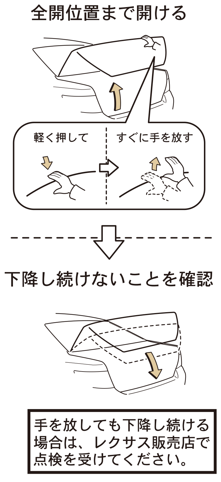 手を放してもさらに下降し続ける場合、ダンパーステーの保持力が低下している可能性があります。レクサス販売店で点検をお受けください。