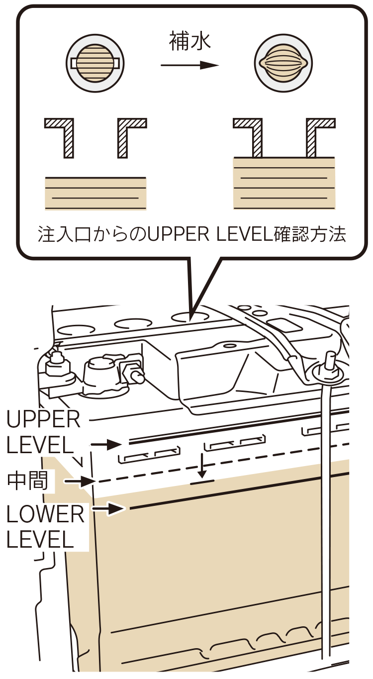 バッテリー液面がUPPER LEVEL(上限)とLOWER LEVEL(下限)の中間以下のときは、UPPER LEVEL(上限)まで補充液または蒸留水を補充してください。