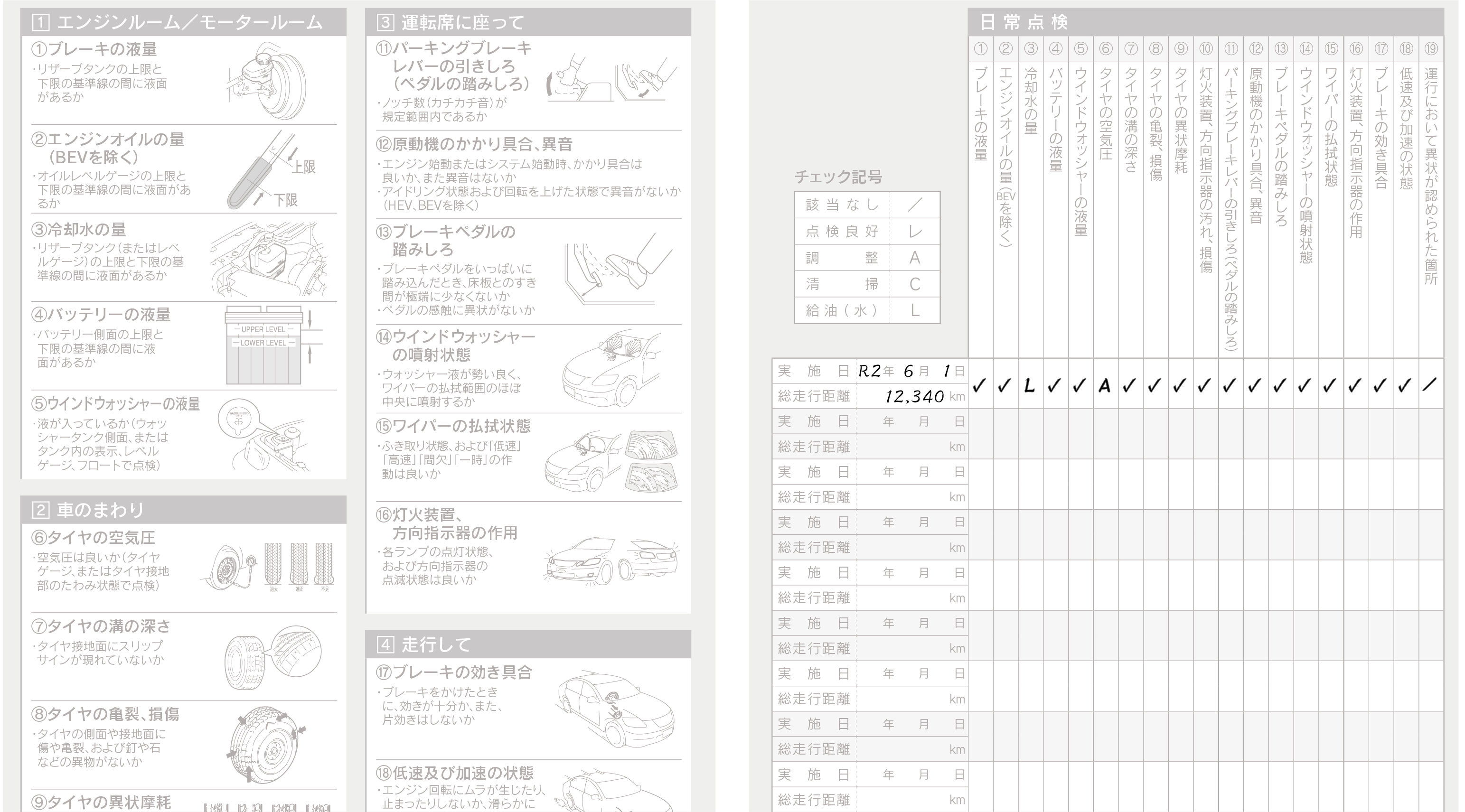 実施者(お客様ご自身またはレクサス販売店等)が、「日常点検記録」に記入します。
