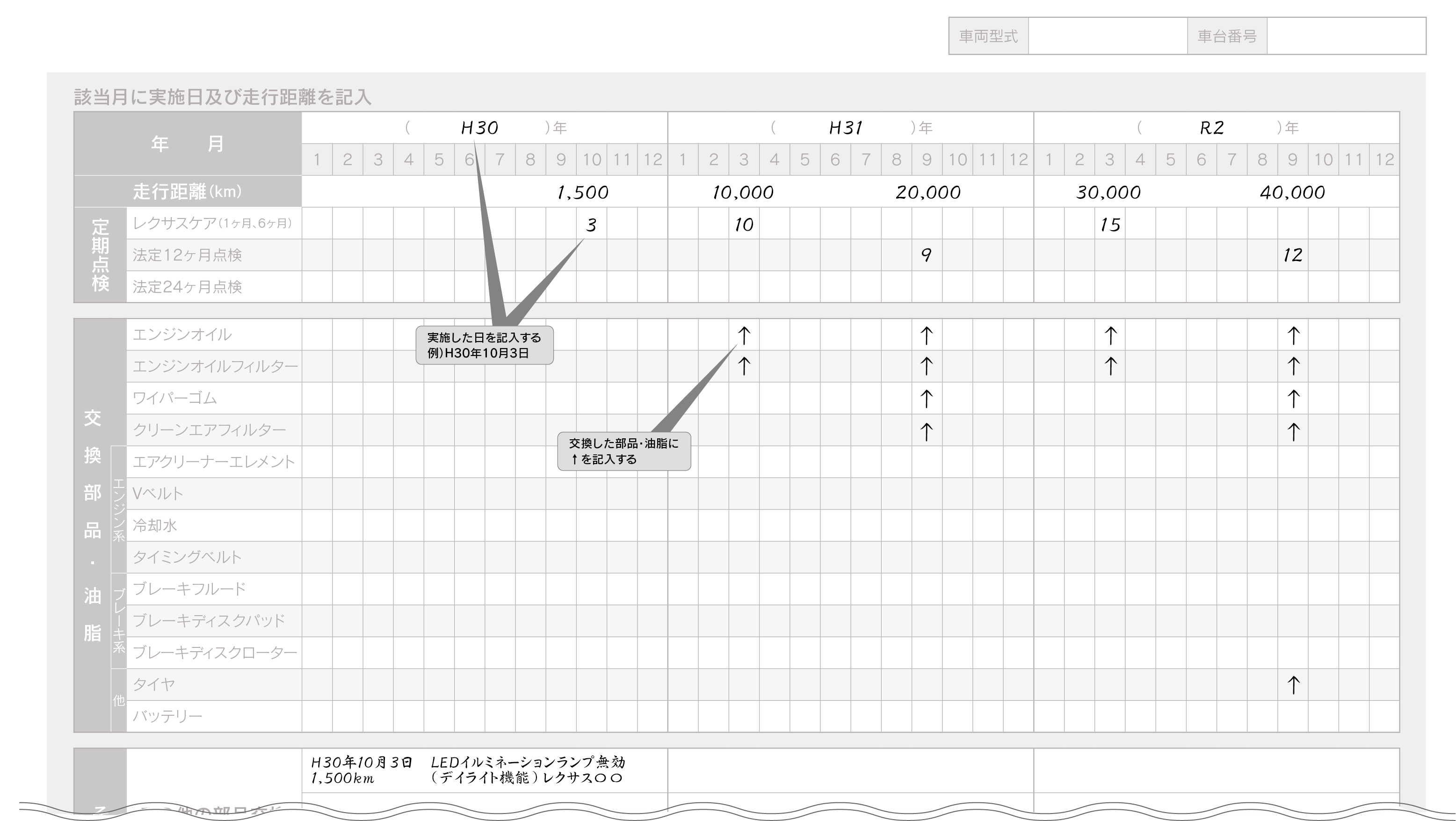実施者(お客様ご自身またはレクサス販売店等)が、「点検整備履歴一覧」と「定期点検(特定)整備記録簿」に記入します。