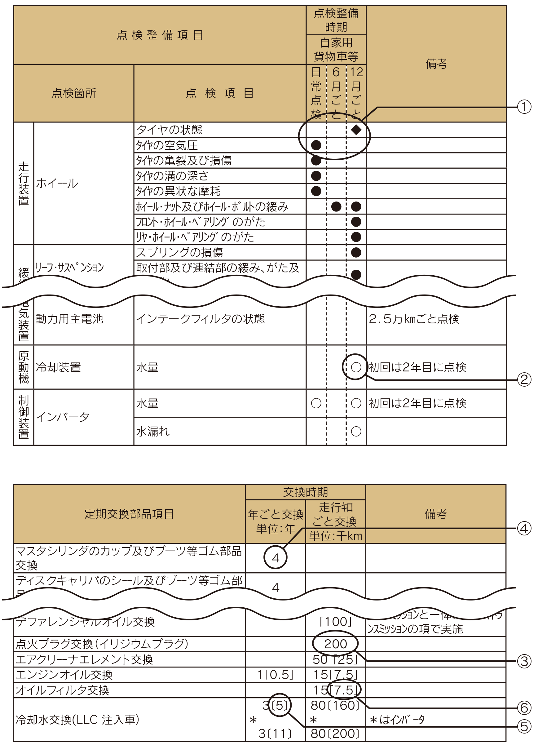 ①「●および◆」は法令で定められた点検時期を示し、そのうち「◆」は距離項目を示します。