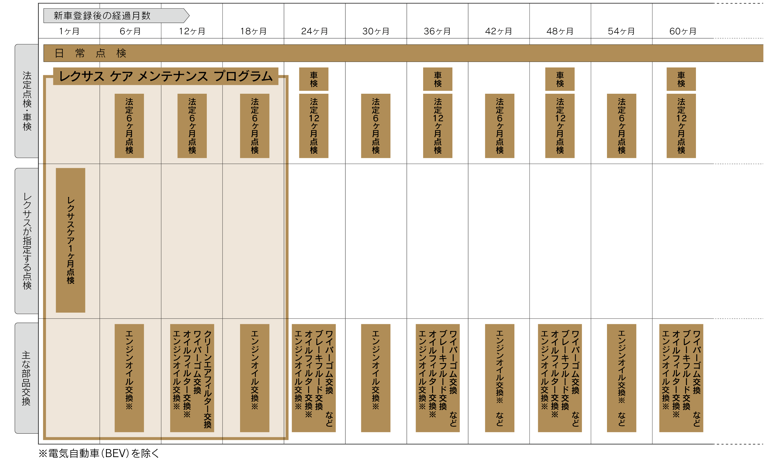 レクサス車の点検整備・検査には、法令で定められた点検整備(法定点検)・検査と、レクサスが指定している点検整備がございます。レクサスでは、「レクサス ケア メンテナンス プログラム」として、初回車検前までの2年間の定期点検整備および指定部品の交換を無料で実施いたします。