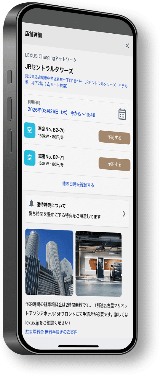 - LEXUS Chargingネットワークでは、予約なしのご利用のほかに、レクサス充電ステーションの充電器の場合は4時間まで、販売店の充電器の場合は30分まで、充電日時を指定予約が可能です。