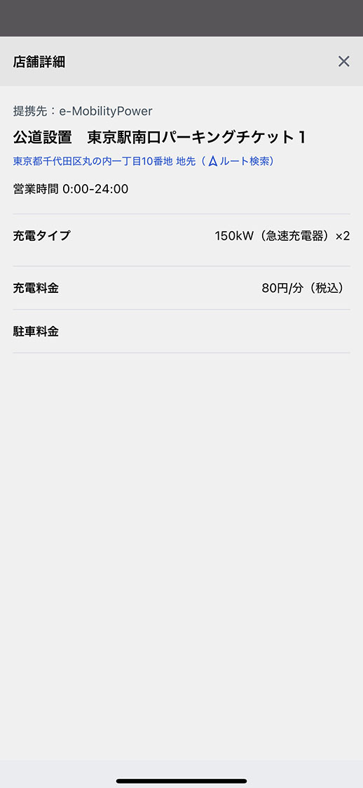 ホーム画面からアプリを起動し、地図検索の絞り込みからe-Mobility Powerネットワークにチェックを入れ結果を表示。充電を行いたいステーションの情報を確認。