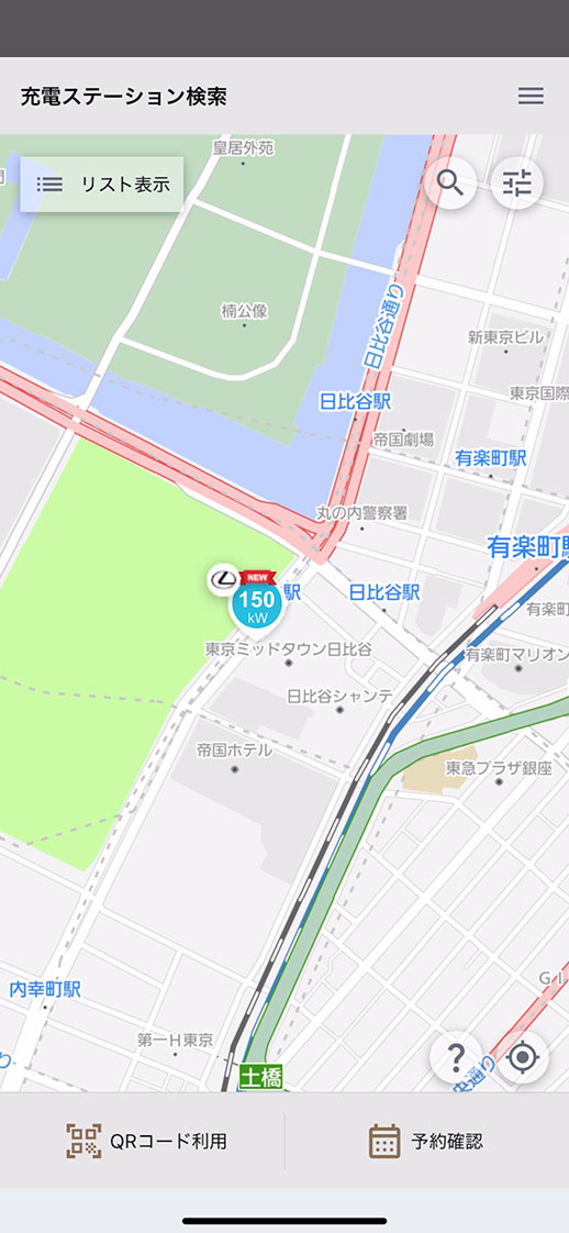 TEEMOに遷移後、アプリ上の地図画面が表示されたら、絞り込みからLEXUS Chargingにチェックが入っていることを確認、それ以外のチェックを外して結果を表示。予約する充電器を選択します。