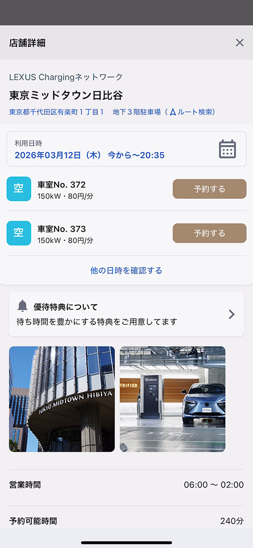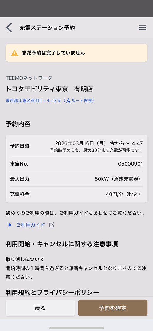 店舗詳細画面が表示されたら充電を行いたい日時を指定し確認画面へ。予約確認画面で入力に間違いがないことを確認し規約やご注意事項を読み予約を完了させます。