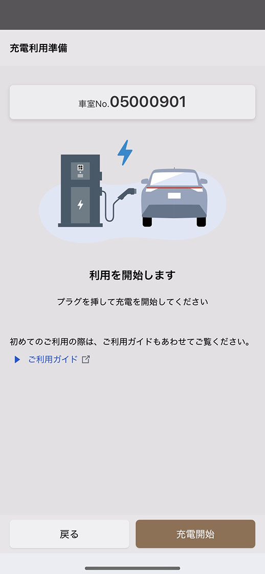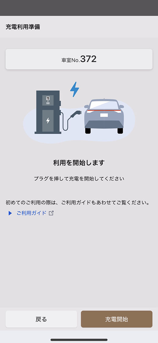 予約日時に充電ステーションへ来店した際、予約を行った車室に入庫し、車両の充電口にプラグを差し込み、アプリ画面の充電開始をタップ。