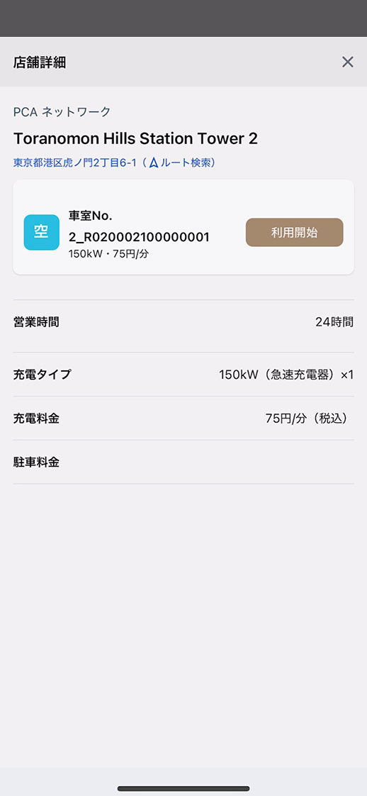 店舗詳細画面に、初回のみPCA利用規約が表示されますので、一読いただき同意いただける場合は同意をタップ。空車になっている車室に入庫し、アプリ画面の利用開始をタップ。