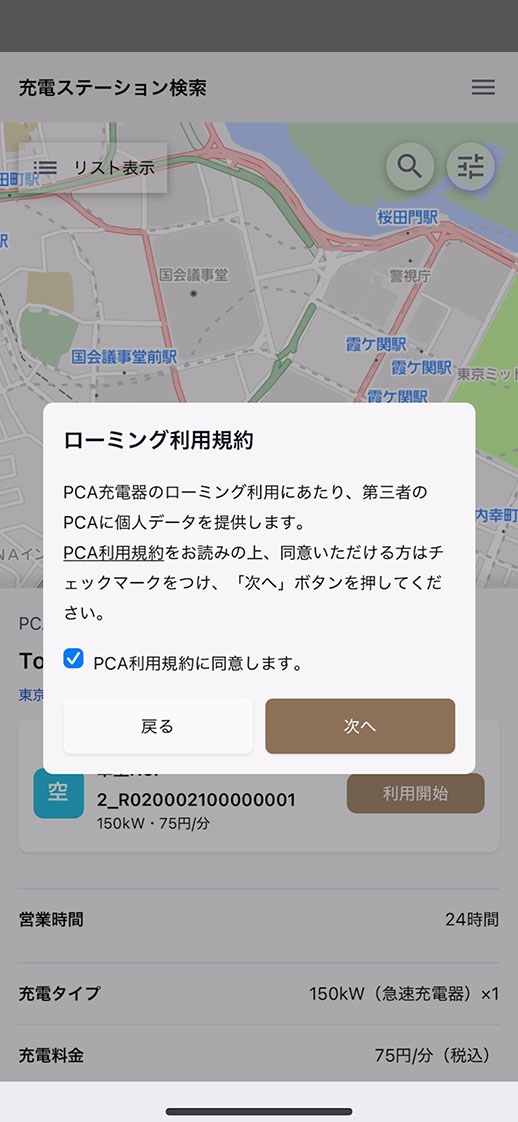 ホーム画面からアプリを起動し、地図検索の絞り込みからPCAにチェックを入れ結果を表示。利用したい充電ステーションを選択。