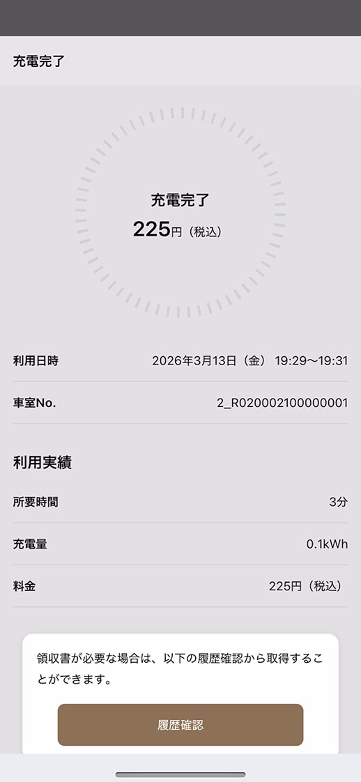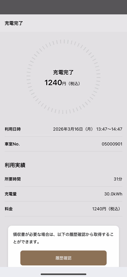 充電の状況はアプリ画面からご確認いただけます。充電が完了するとスマホに通知されますので、充電プラグを戻し、料金のお支払いが完了したら出庫します。
