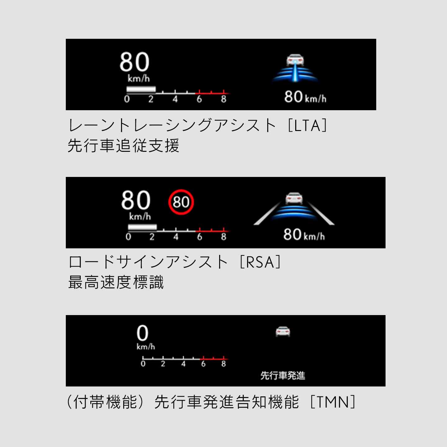 運転に必要な情報をウインドシールドガラスの視野内に投影します。車速、レーン表示、簡易ナビゲーションなどをエンジンフードの上部にあるかのような距離感でワイドに表示。内容に応じて重要なパートをカラーで表示することで、情報を分かりやすく認識することができます。