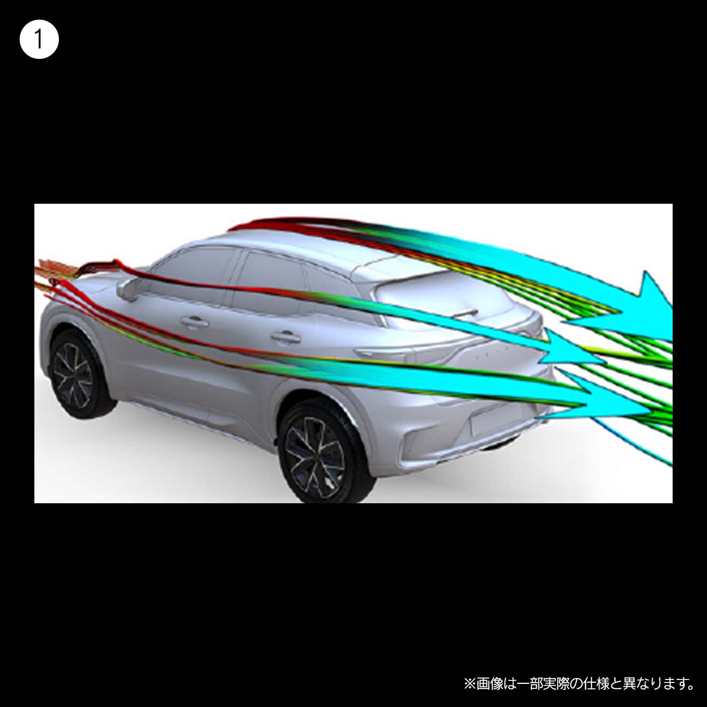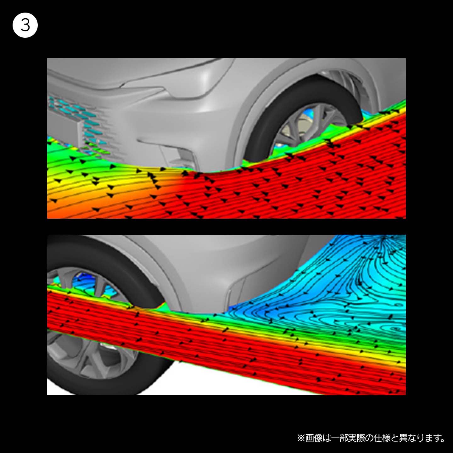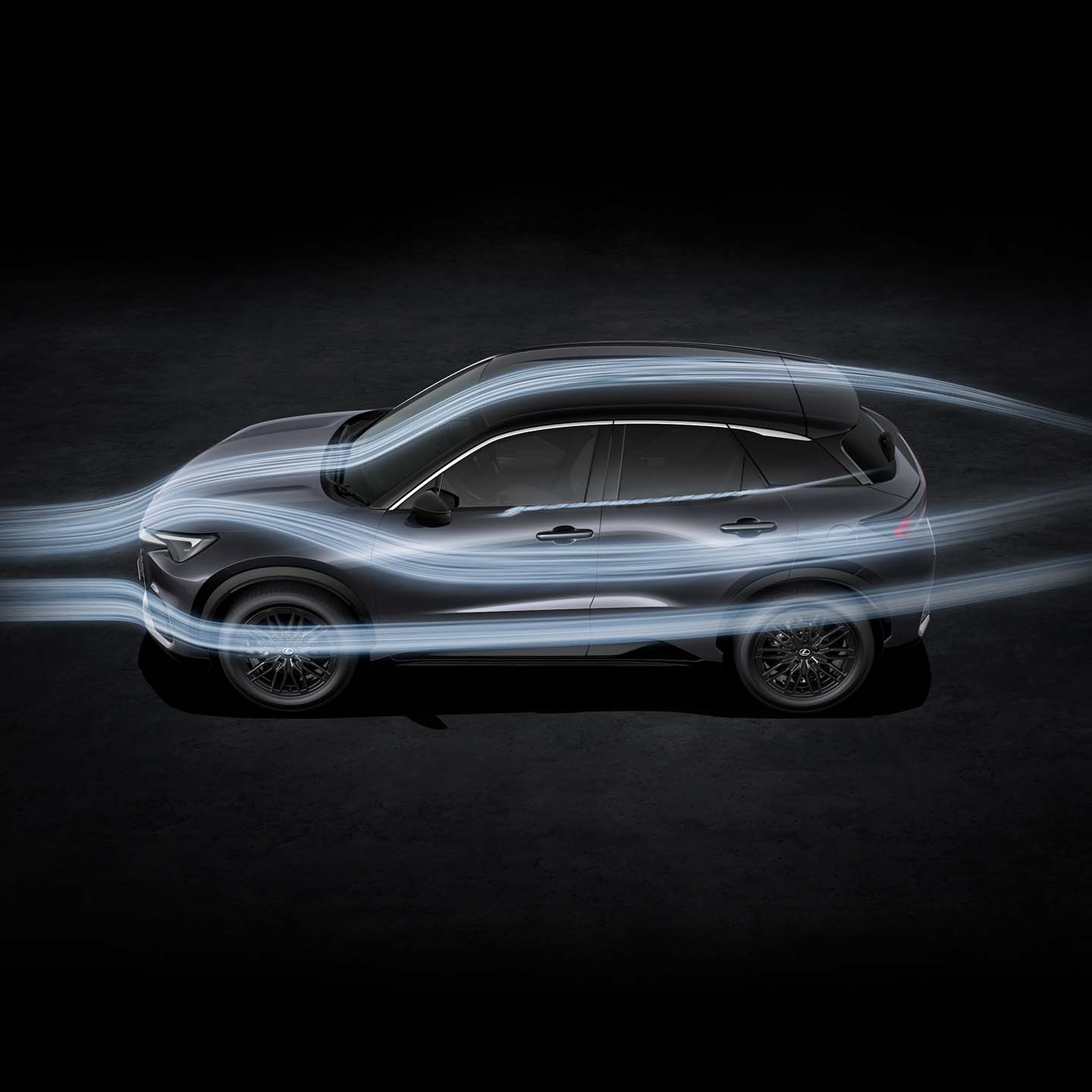 音や振動の発生源を抑制する源流対策にこだわって開発しました。エンジンマウントを最適配置し、起動時のショックを低減。エンジン本体へのバランスシャフトの採用により、低回転時のフロア振動を抑制しています。さらに、エアクリーナホースへのレゾネータ追加による吸気音低減など、エンジン周りの源流対策を施すとともに、排気管ではエンジンからの振動伝達を低減するフレキシブルパイプを採用。メインマフラー容量を拡大し、排気音を低減しています。また、遮音・吸音対策も徹底して実施。吸音層と遮音層の2層からなるダッシュインナーサイレンサーは、さらに吸音層を加えた3層構造に。各フェンダー対しては不織布基材のフェンダーライナーと吸音材を設定。そのほか、外気導入ダクトやフロントピラーガーニッシュ、グローブボックスにも遮音・吸音対策を施し、エンジンノイズや振動の低減を図っています。さらに、フロントフードには、ボディに伝う空気の流れを整えるために、フードシールを採用。空気の圧力変動を抑制し、静粛性を高めています。