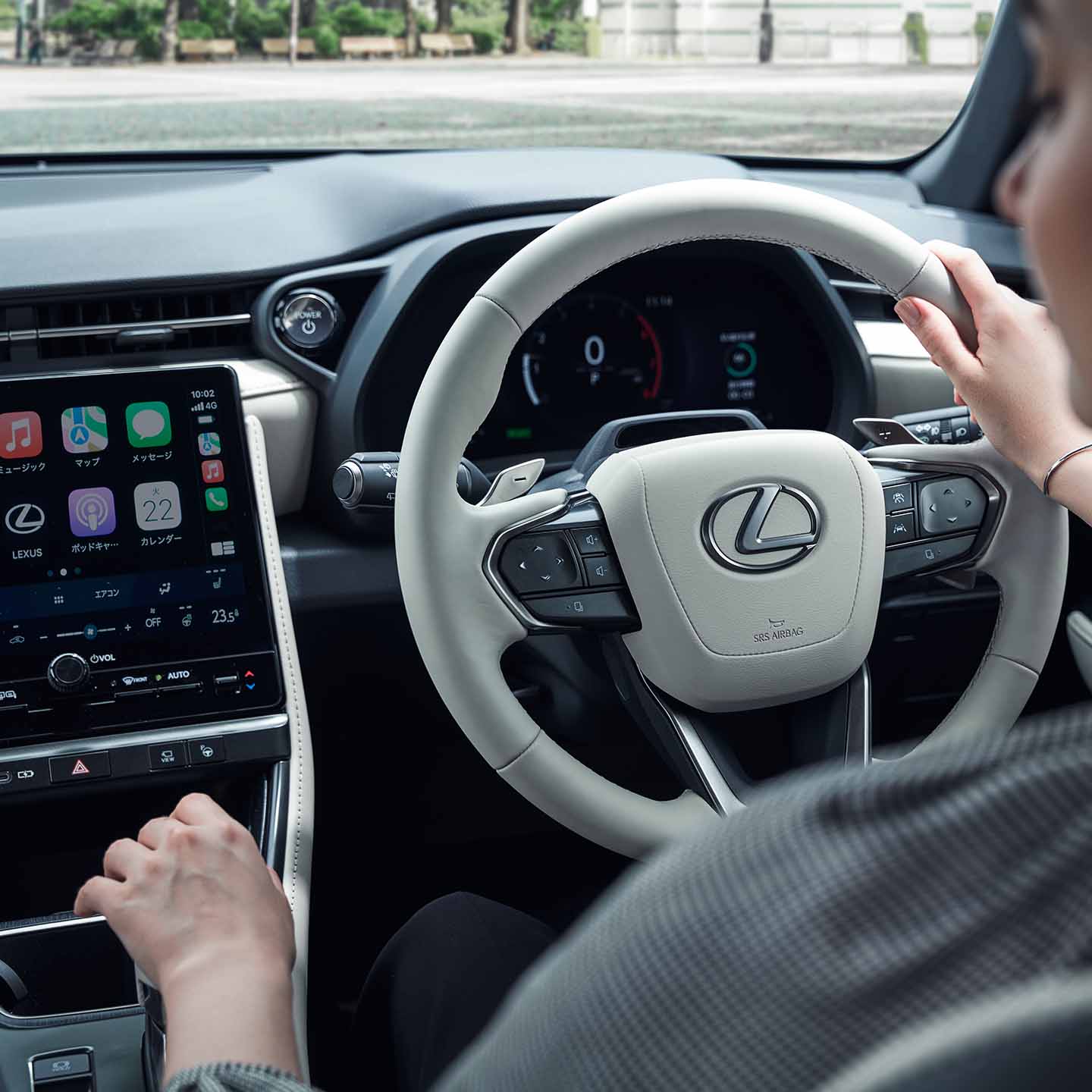 イグニッションONした際のオープニングサウンドやシートベルトリマインダー、クリアランスソナー、その他警告音などに新しいレクサスコミュニケーションサウンドを開発。すっきりとした楽器的な波形、奥深い和音など、エンジンサウンドでも大切にしているレクサスならではの音楽的な考え方を採用し、認知のしやすさと耳へのやさしさを両立する音を設定しました。その音質を磨き上げるため、音楽プロデューサーとしても著名な音楽家(ギタリスト)吉田次郎氏とともにチューニングを重ねました。