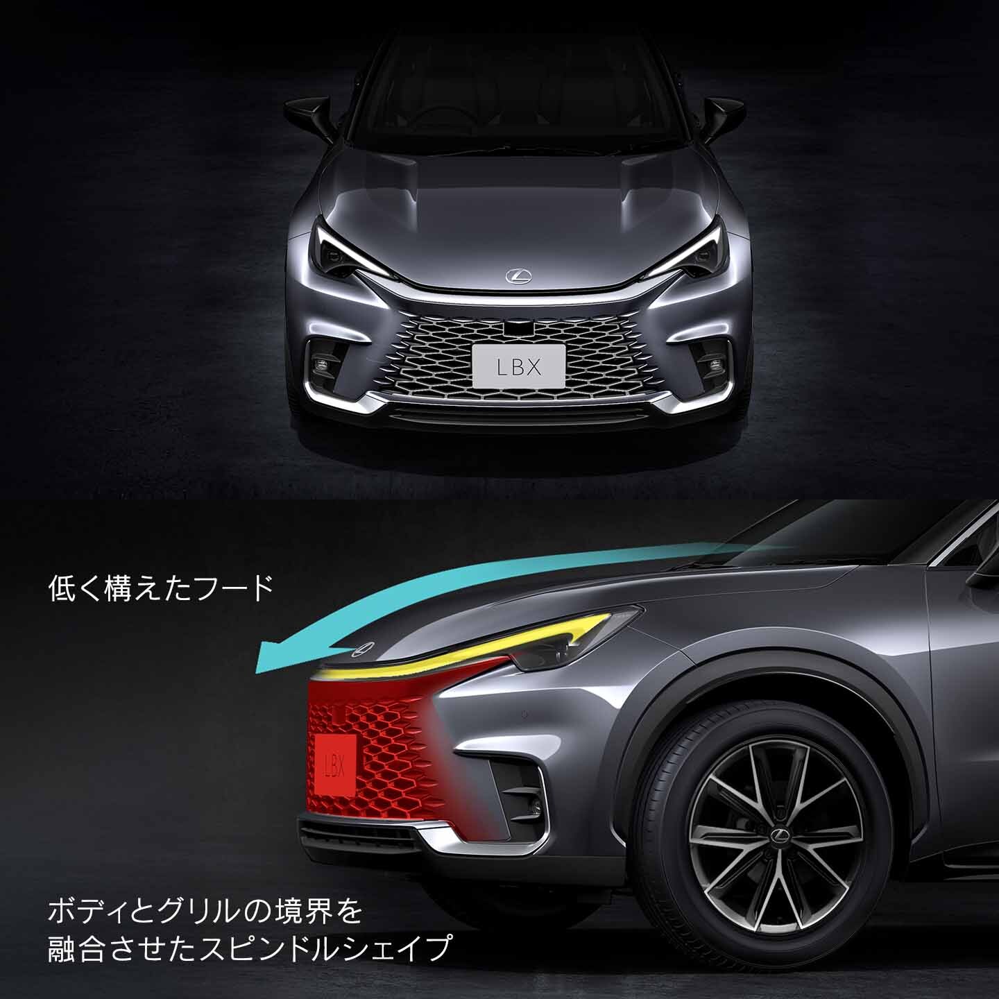 UNIFIED SPINDLEによるアイコニックな表情に加え、空力性能にも貢献する低く構えたフード造形とボディとグリルの境界を融合させたスピンドルシェイプの塊により、低重心で見応えある存在感を訴求。さらに、大径タイヤを強調する張り出したフェンダー造形で、ダイナミックでスタンスの良い構えを強調しました。
