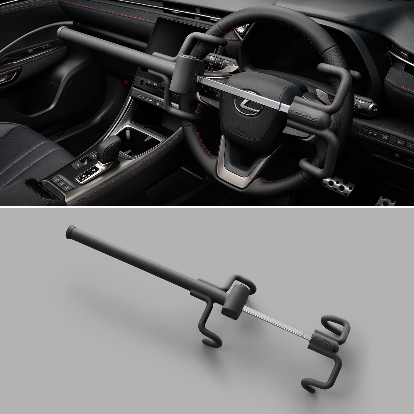 スプリング内蔵によりアームをスムーズに伸ばせ、ステアリングへ簡単に固定できます。表面を軟質樹脂でコーティングし車両への傷つきを防止。視覚的にアピールするデザインにより防犯効果を高めます。