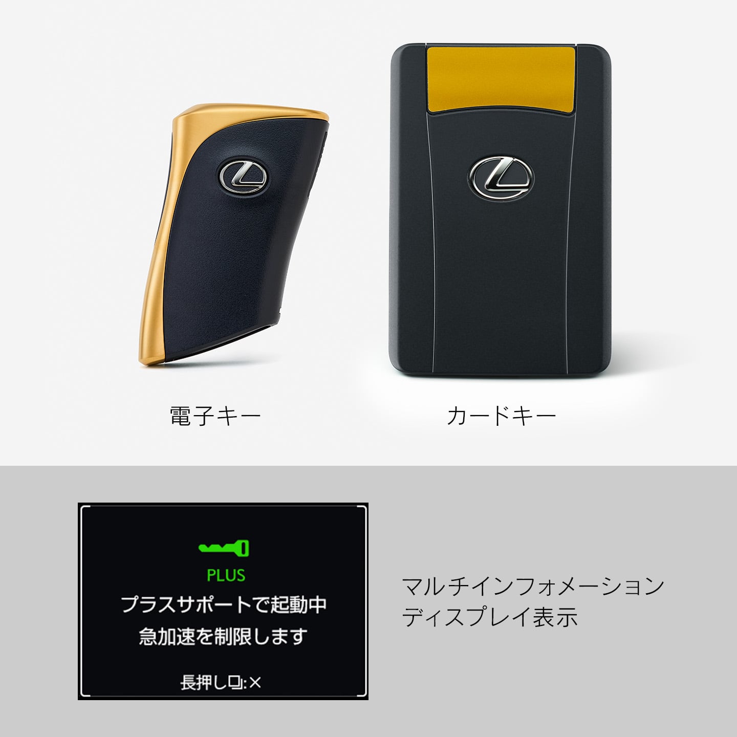 ドアを解錠するだけで、プラスサポート(急アクセル時加速抑制)を自動で始動させる専用キー。障害物の有無にかかわらず、アクセルの踏み過ぎや踏み間違いを検知するとクルマの加速を抑制し、警報ブザーとディスプレイ表示でドライバーに注意喚起します。合流など加速が必要なシーンでは加速が可能です。