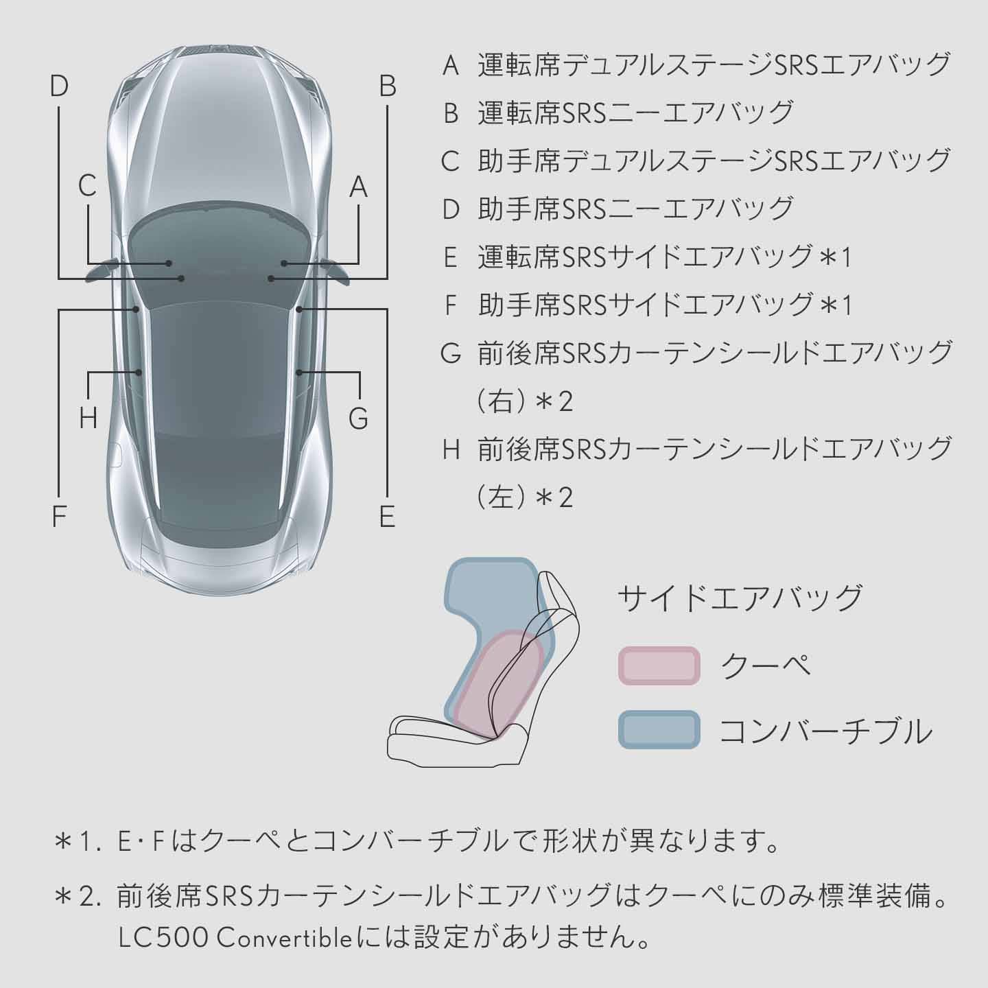 身体への衝撃を分散・緩和するエアバッグを設定。カーテンシールドエアバッグの設定ができないコンバーチブルでは、サイドエアバッグの保護エリアを頭部まで拡大
