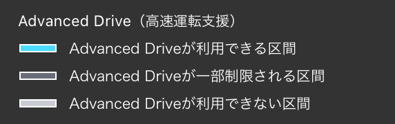 Advanced Drive 対応エリアマップに記載されている⾼速道路情報は、2025年8月時点でAdvanced Drive※(高度運転支援)機能が利用できる道路、又は機能が一部制限される道路、利用できない道路の情報となります。
