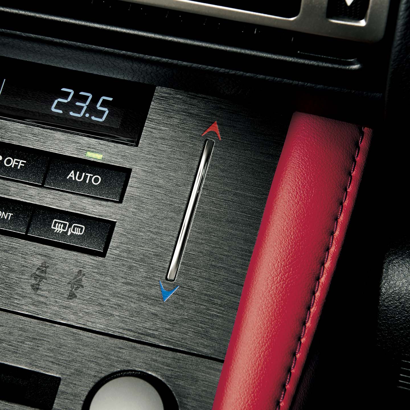 金属のスイッチ部を指先でスライドさせるだけの直感的な操作でオートエアコンの設定温度を変えることができます。上下の矢印をタッチすることでも温度調整が行えます。