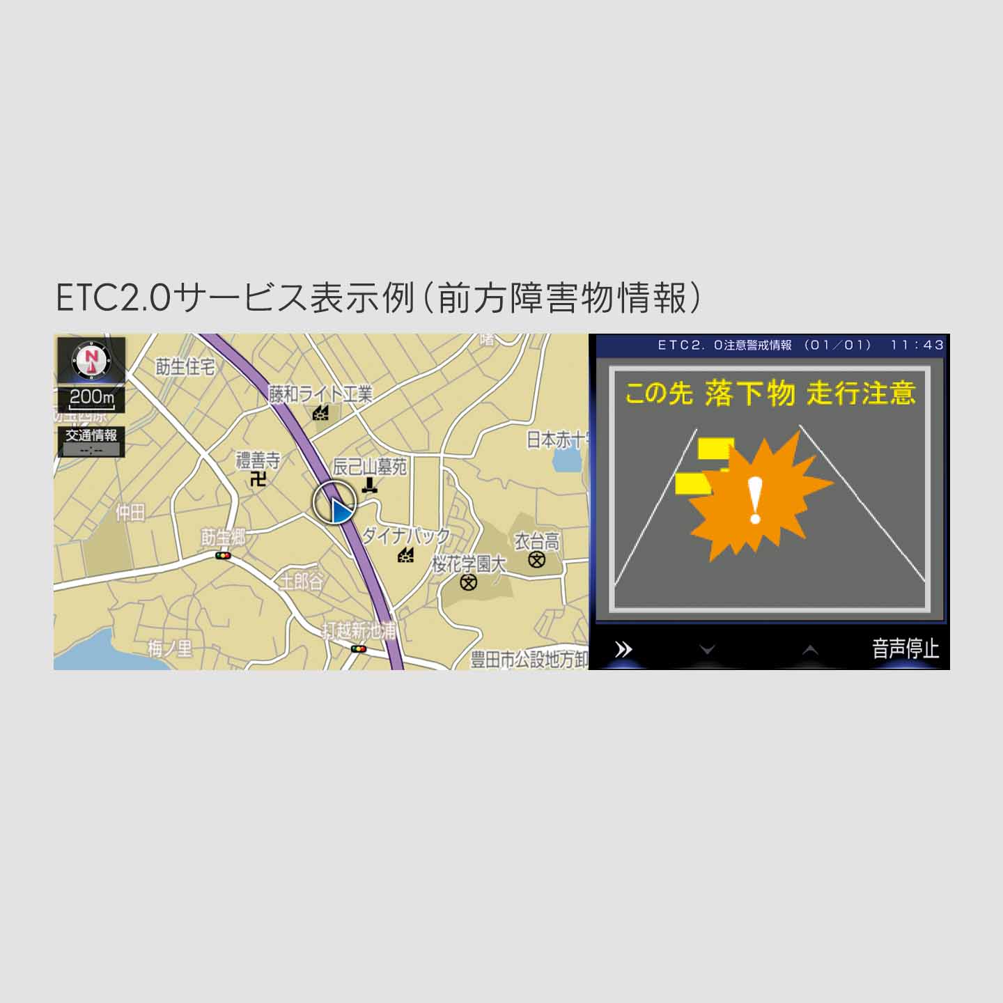 路上に設置されたインフラ設備との双方向通信を行うETC2.0ユニット(VICS機能付)を搭載したナビゲーションシステムにより、安全運転をサポートする情報を画面表示や音声で提供します。 <高速道路で提供するETC2.0サービス> 見通しのきかないカーブの先の渋滞や停止車両といった情報をカーブの手前でお知らせしたり、高速道路で合流してくる車両の存在を合流部の手前でお知らせします。また、進行方向先の交通状況やサービスエリア、パーキングエリアの混雑情報などもお知らせします。