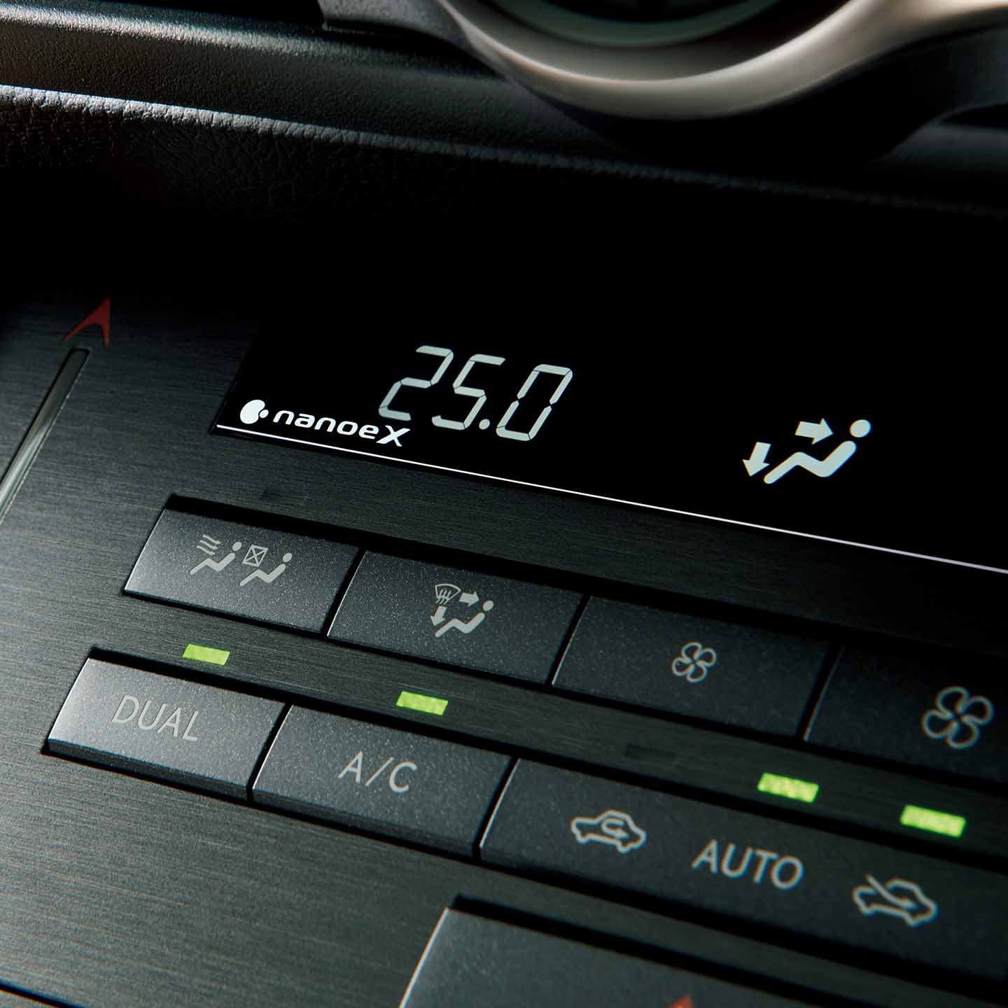 ナノイーXは、ナノイーに比べて、効果の元であるOHラジカルをより多く含む微粒子イオンです。中央のエアコン吹出口(運転席側)から室内へ放出されます。車室内を快適な空気環境に導くナノイーがさらに進化しました。