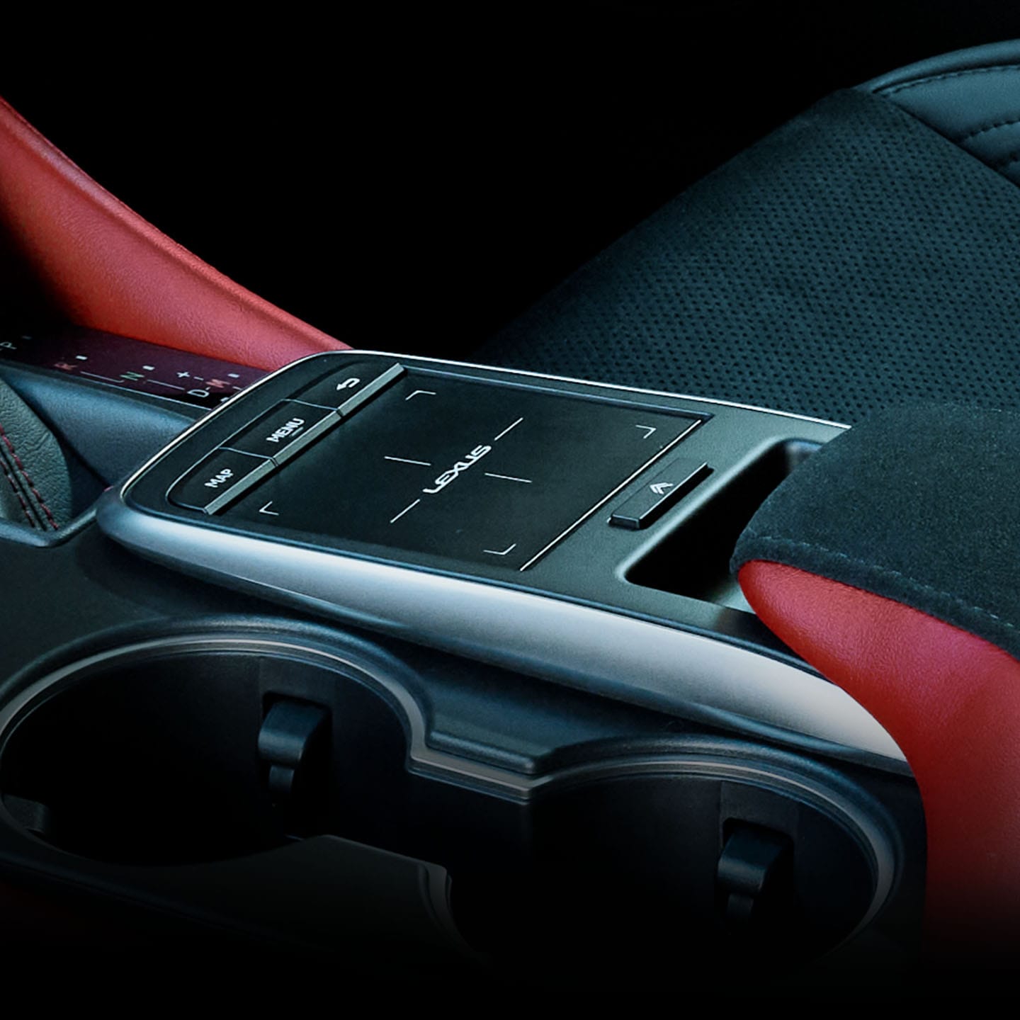 ピンチイン・ピンチアウトによる地図の縮小・拡大など、10.3インチタッチワイドディスプレイのリモート操作を指先で行えます。タッチパッドの前後には戻るボタンと、マルチメディアや空調など各メニュー内で機能を切り替えられる「サブファンクションスイッチ」を設定しています。