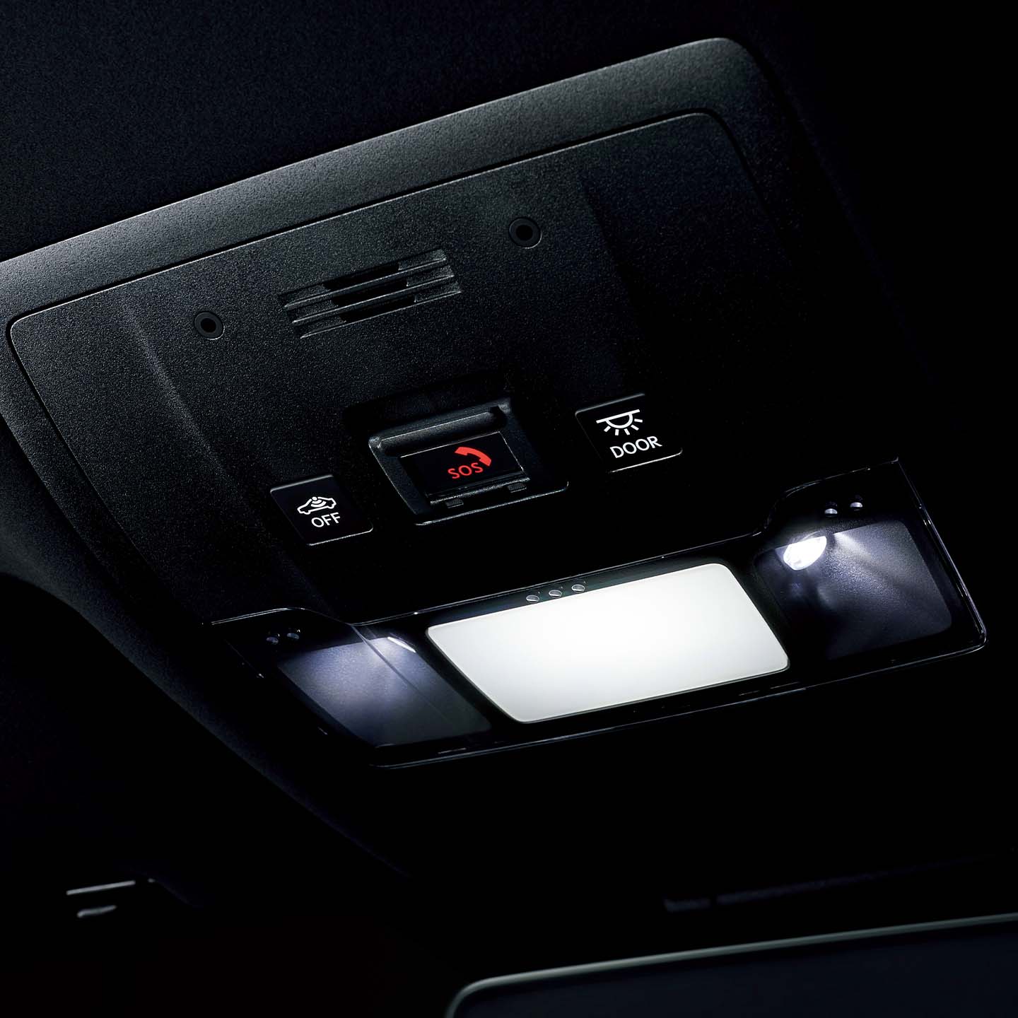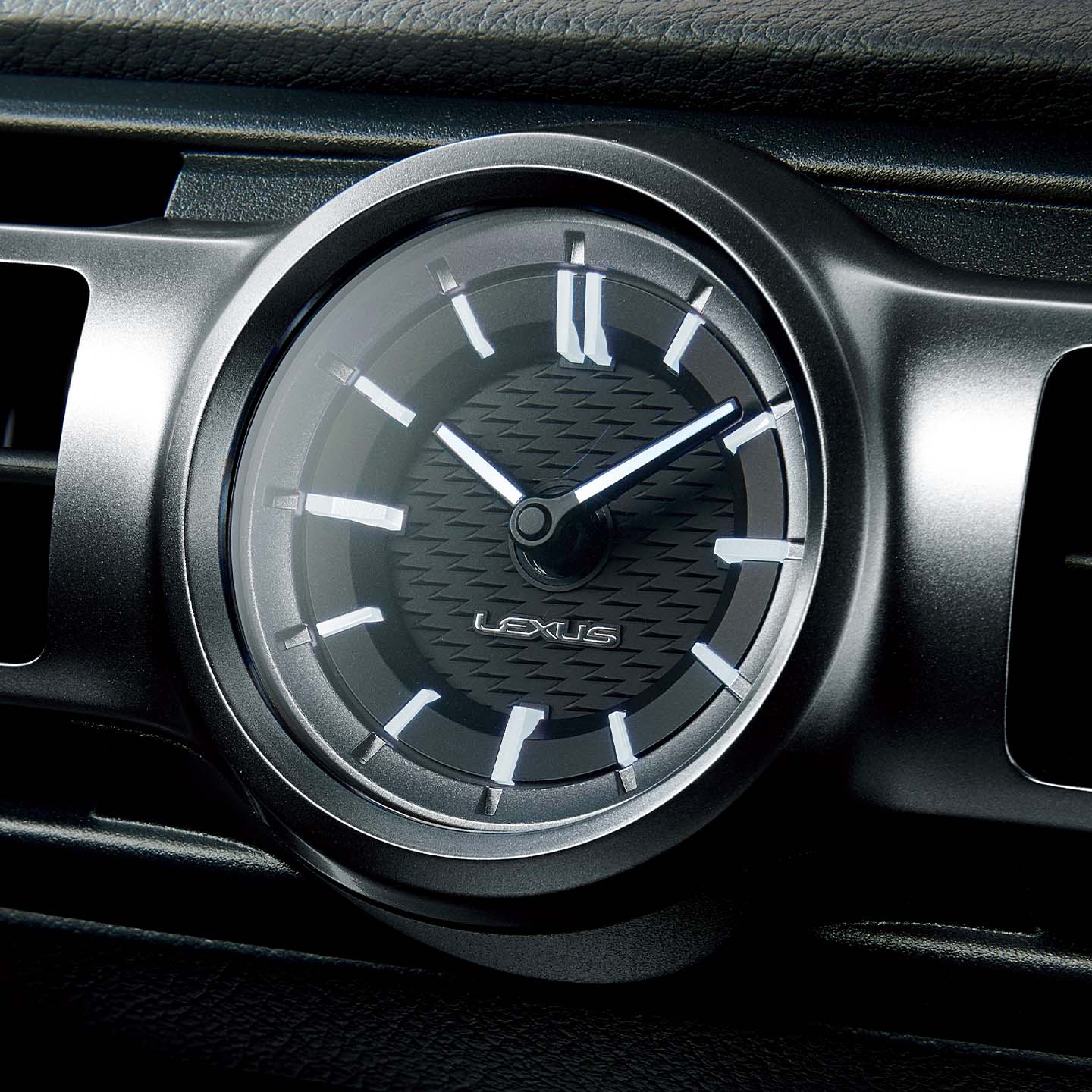 L字パターンのレリーフ装飾を施した文字盤と、シルバーサテン調のリングで立体感を強調したエレガントに時を刻むアナログクロック(GPS時刻補正機能付)。指針と目盛りは自発光式で、乗車時に発光してドライバーを迎え入れ、上質な空間を演出します。