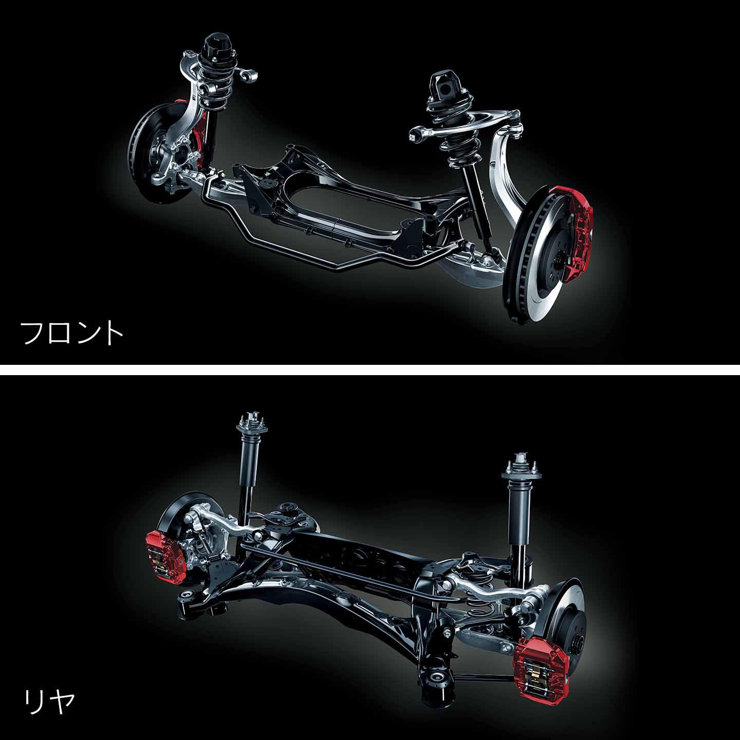フロント/アルミ対向6ピストン、リヤ/アルミ対向4ピストンモノブロックキャリパーに高摩擦パッド*を採用し、高い制動性能と耐フェード性を確保しました。さらに、大径マスターシリンダーやペダル比の最適化などにより、高い応答性とリニアな効きを実現。コーナー進入時のハードなブレーキングや、車間距離調整の速度コントロールも意のままです。