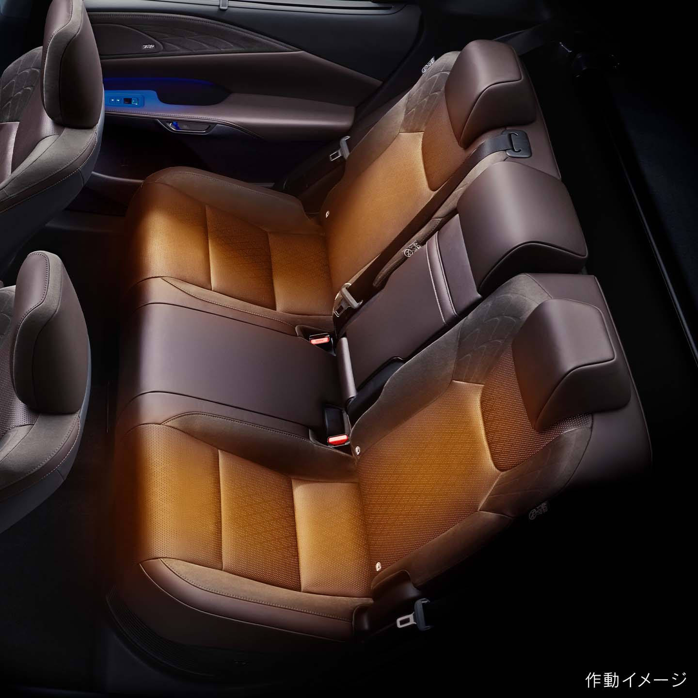 後席シートヒーターは後席4:2:4分割可倒式シート(電動リクライニング&電動格納機能/ベンチレーション機能付)+輻射ヒーター(運転席・助手席)と同時装着となります。