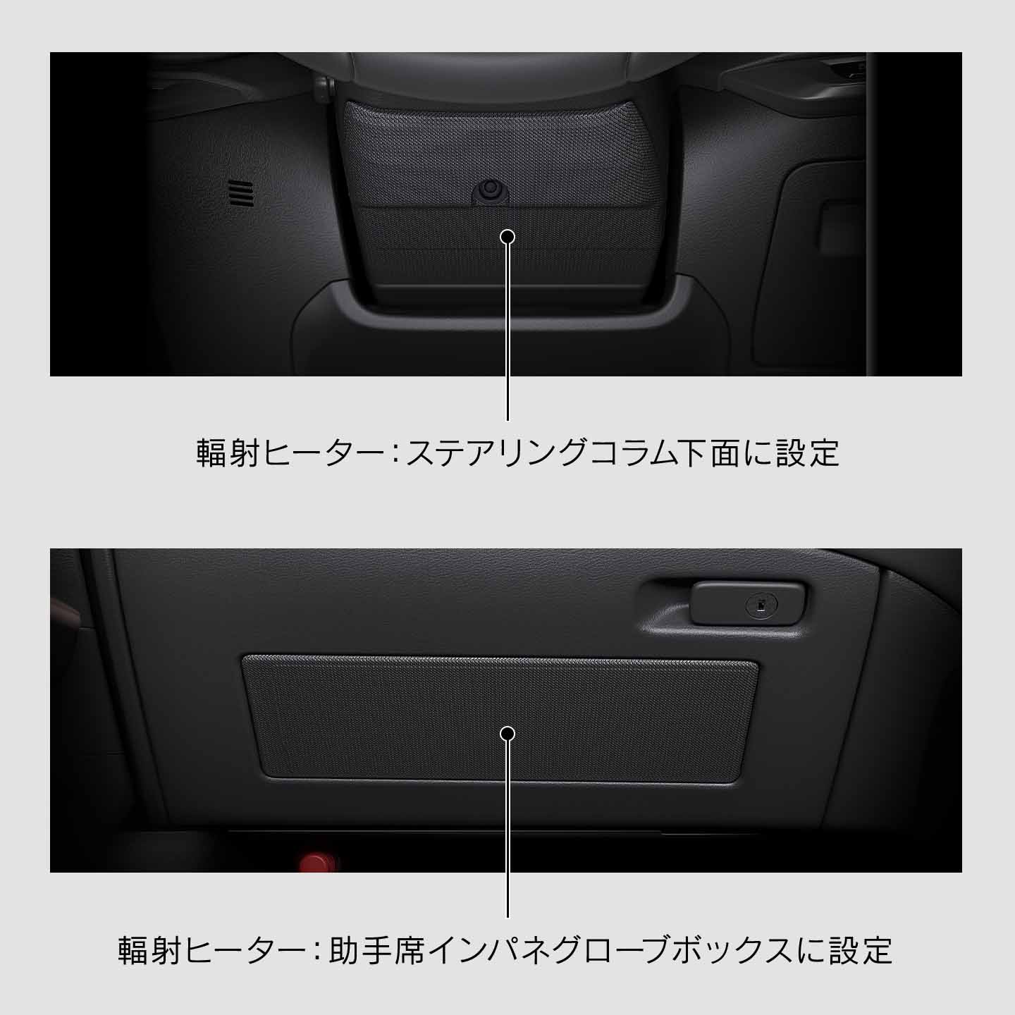 運転席はステアリングコラムの下面、助手席はインストルメントパネルのグローブボックス面に、遠赤外線輻射ヒーターを設置。運転席・助手席のシートヒーターのスイッチをONにすると、暖かさを感じるまでわずか1分という速さで、膝から下を一気に暖めます。