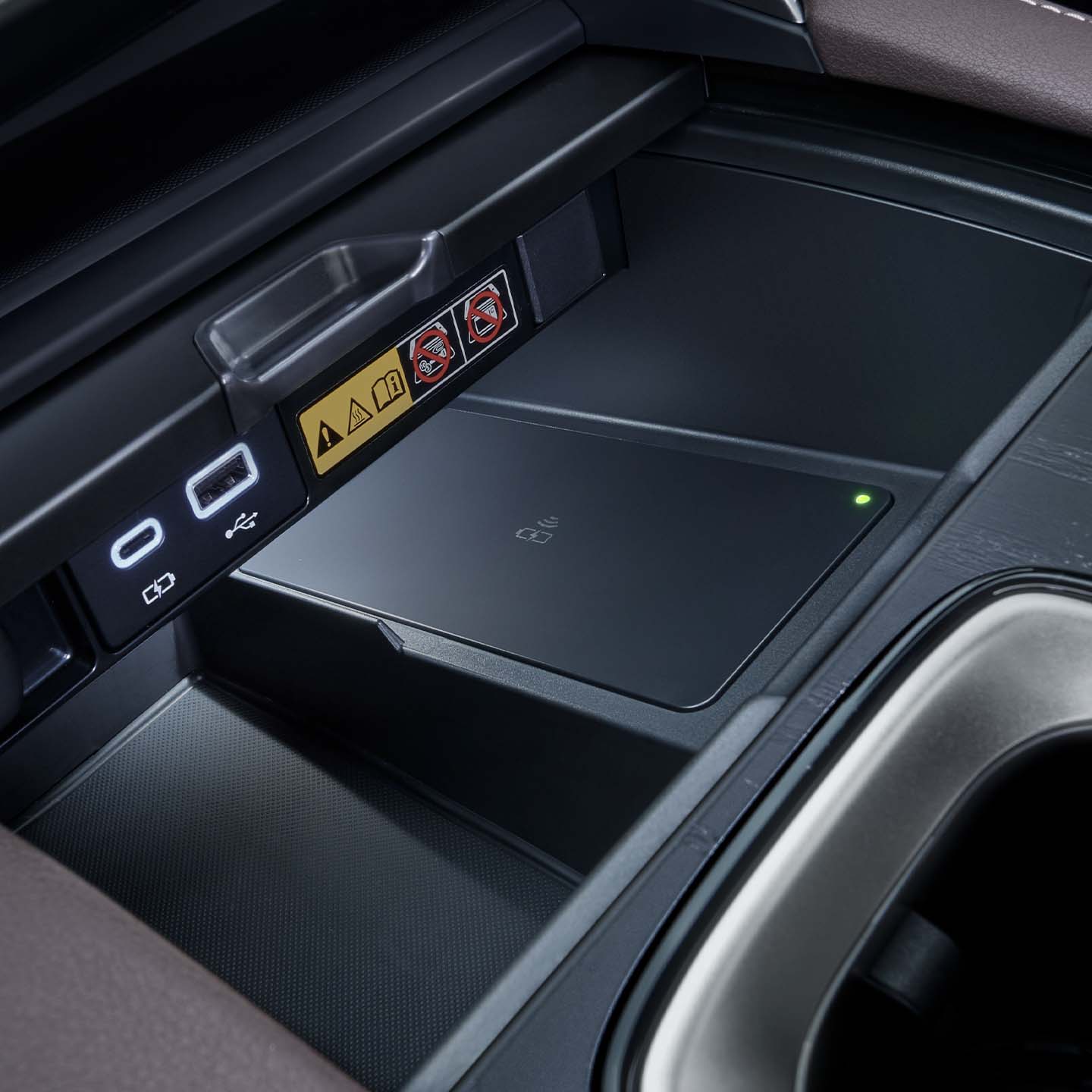 フロントコンソールトレイ部の充電エリアに置くだけで、スマートフォンやモバイルバッテリーなどの充電が行えます。