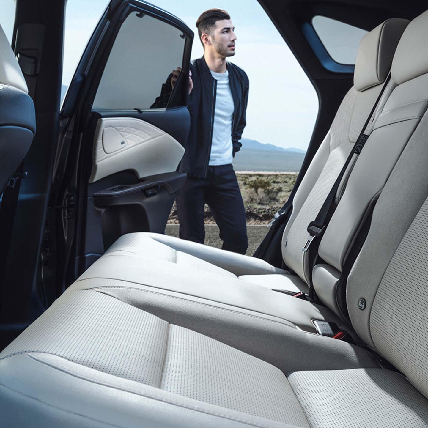 (電動リクライニング&電動格納機能/ベンチレーション機能付) リヤシートはシートバックの断面の変更により頭部の揺れを抑え、酔いにくいシート形状としています。荷物の数や大きさに合わせてスペースを拡大する際には、タッチディスプレイ内のソフトスイッチおよびラゲージルーム内のスイッチ操作により後席シートバックの格納・引き起こしが可能です。