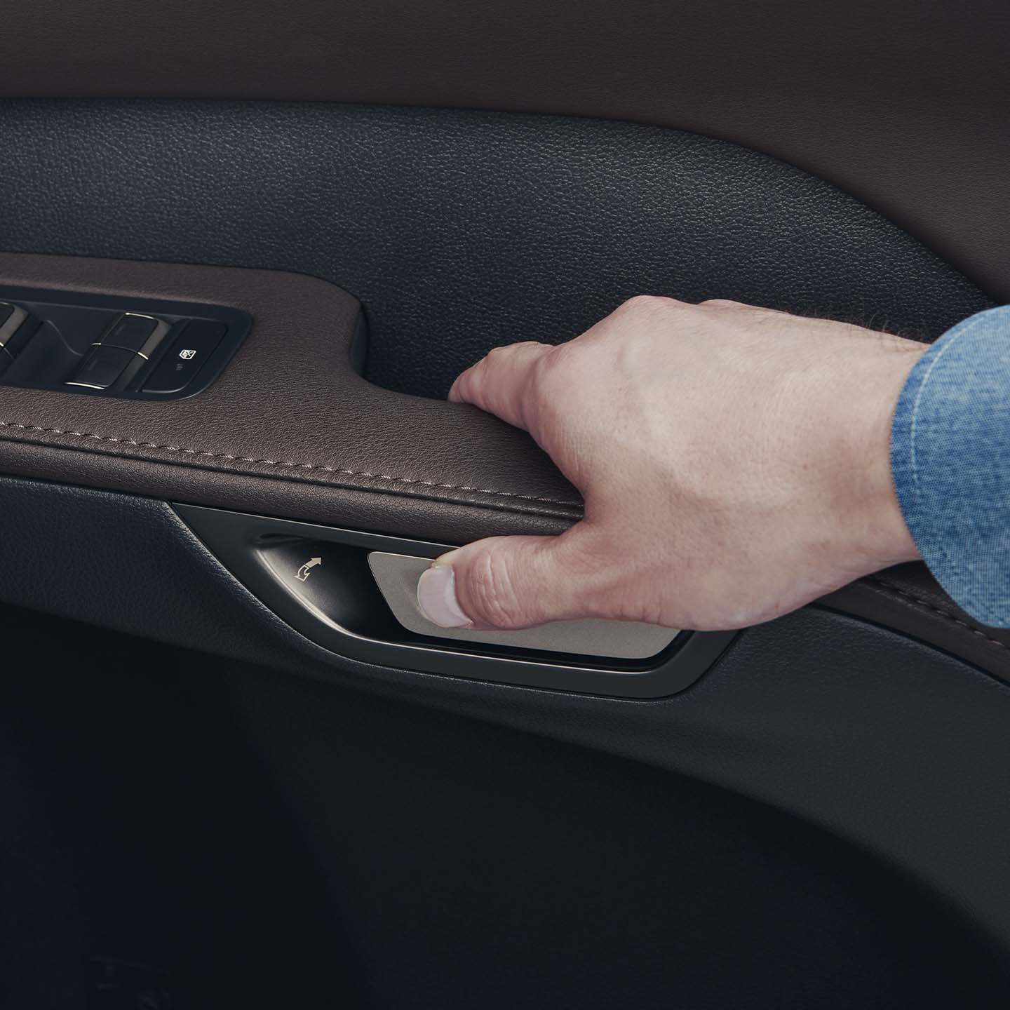 e-ラッチアウトサイドドアハンドル(足元&ドアハンドル照明付)/e-ラッチインサイドドアハンドル 滑らかに動く障子のように、無駄な動きなく一定の力でドア開閉を行えるよう、従来のメカ機構によるアンラッチを電気制御に置き換えたe-ラッチを搭載しました。乗車時のドア開操作では、ドアを引く動作そのままにハンドル裏に設けたスイッチを押してドアオープン。降車時のドア開操作でもプルハンドルをグリップしたままでスイッチを押して、ワンアクションでのスムーズなドアオープンを可能にしました。