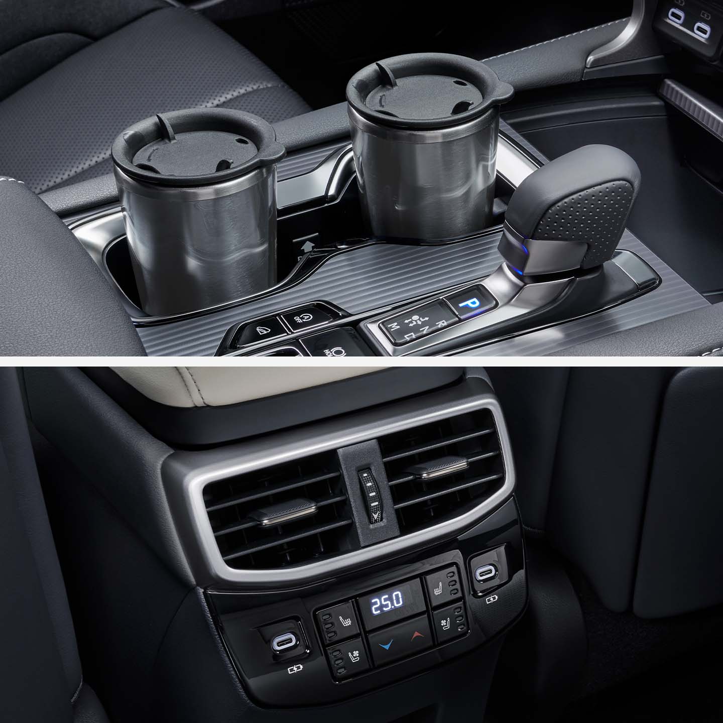 ■カップホルダー(昇降式) さまざまなカップやタンブラーを収納できる、昇降式のカップホルダー。ホルダー底面に滑り止めを兼ねたマットを設定しているため、運転中でも前方から視線をそらさず片手でペットボトルの蓋が開けられます。 ■フロントコンソールトレイ 開閉式の大型収納をセンターコンソール前方に配置。 ■収納ボックス おくだけ充電®を設定することが可能。 ■リヤ席から温度コントロールも可能。