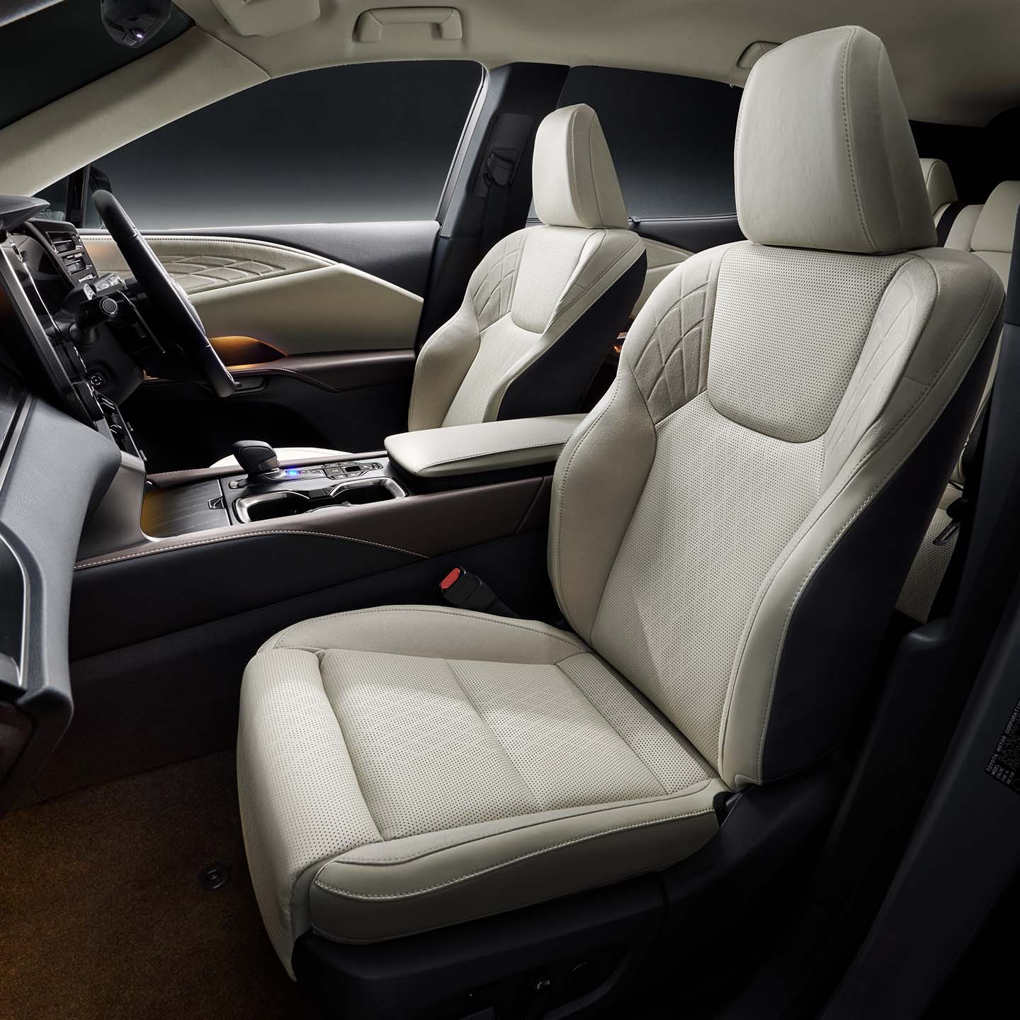 負担の少ない姿勢がとれ、長時間の運転でも姿勢の崩れないTNGA骨格を採用するとともに、深吊り構造を取り入れました。表皮を固定する位置をパッド側に深く引き込む深吊り構造により、横から荷重がかかった時の、クッションの座圧変化を低減。コーナリング中の姿勢のすぐれた安定性を実現します。また、運転席から助手席のポジション調整ができるように、助手席の内側の肩口に操作スイッチ*を設定しました。