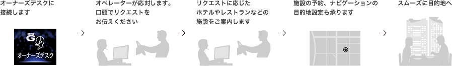 お出かけ前に目的地をお伝えいただくとオペレーターがナビゲーションを設定。ドライブに必要な情報もお知らせします。
