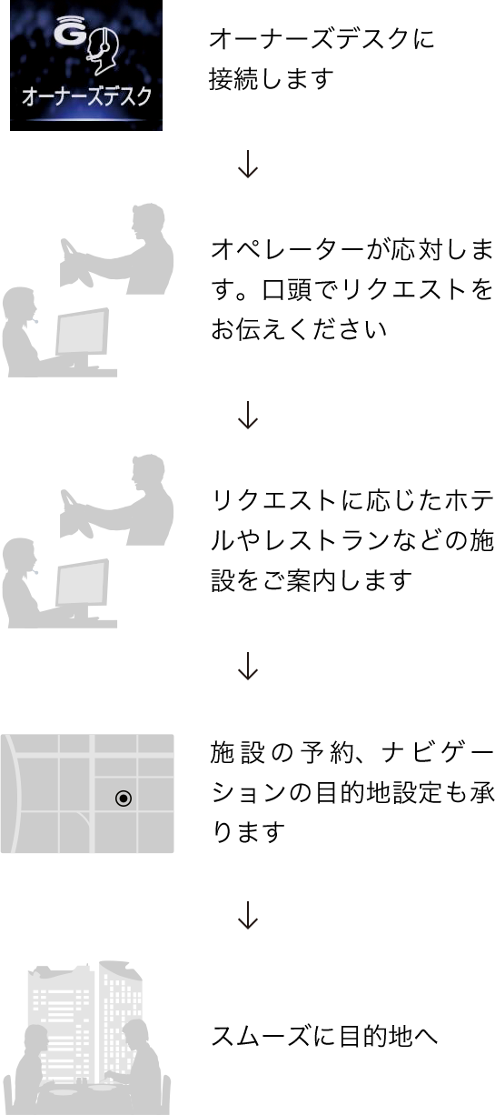 オーナーからのご要望に応じてG-Linkの通信機能を利用し、ナビの目的地設定や各種情報の表示をオーナーに代わって操作・設定いたします。